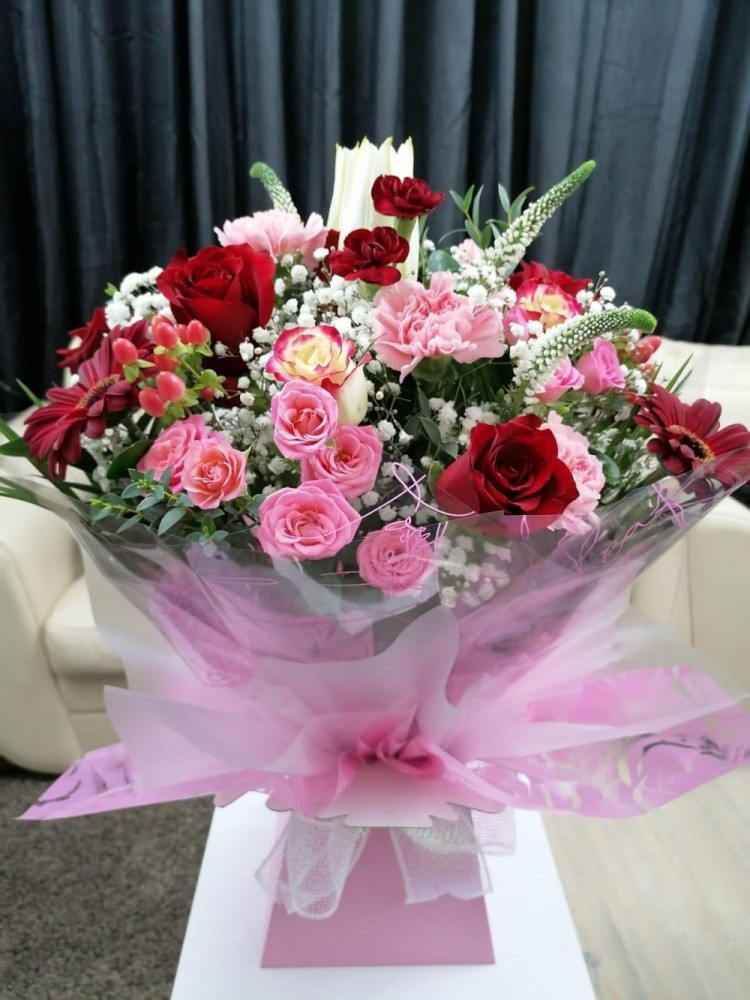 A vibrant and romantic hand-tied bouquet featuring a beautiful mix of red, pink and soft cream blooms, delicately arranged with gypsophila and fresh seasonal foliage. Wrapped in elegant pink tones and finished with a stylish bow, this bouquet is full of colour, texture and charm.