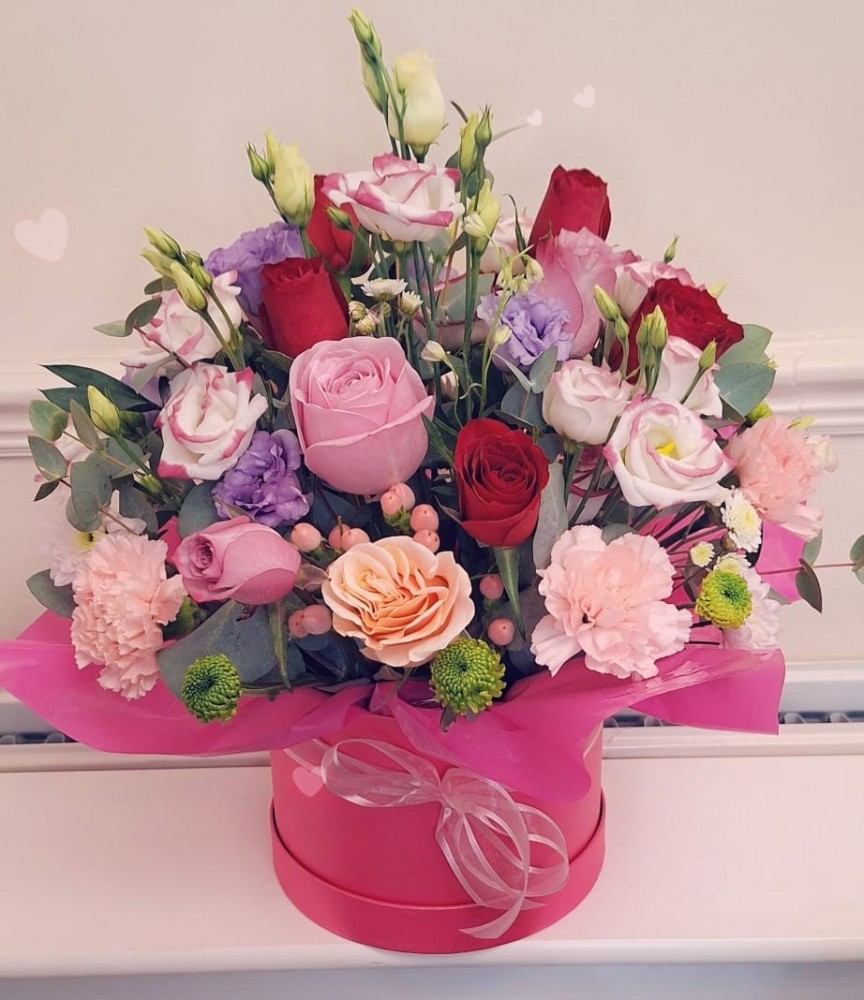 A charming hatbox arrangement filled with a joyful mix of pink, red, peach and lilac blooms, beautifully layered with soft textures and fresh greenery. Designed to feel uplifting and elegant, this arrangement is finished with stylish wrapping and a delicate ribbon for a polished look.