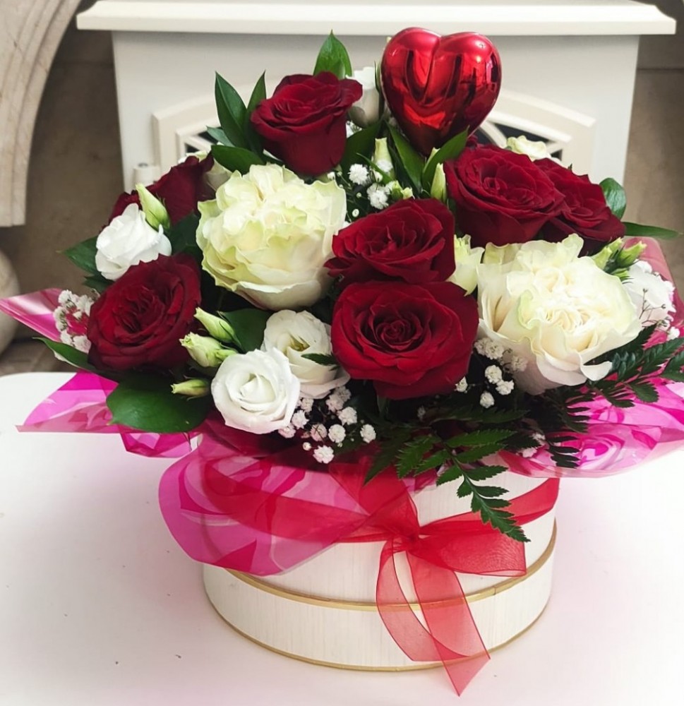 A timeless and romantic hatbox arrangement featuring rich red roses and soft ivory blooms, beautifully accented with delicate gypsophila and fresh greenery. Finished with elegant wrapping, a satin ribbon and a decorative heart detail, this design is a classic symbol of love and togetherness.